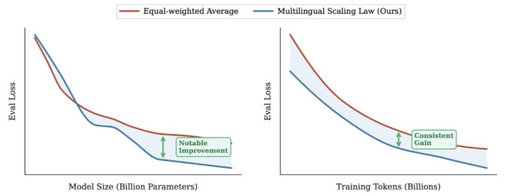图 1:论文提议的多话语 Scaling Law 与传统均匀漫步基线的 Loss 对比。蓝色弧线线路,基于本文表率优化的模子在相似算力下能抓续取得更低的 Loss)