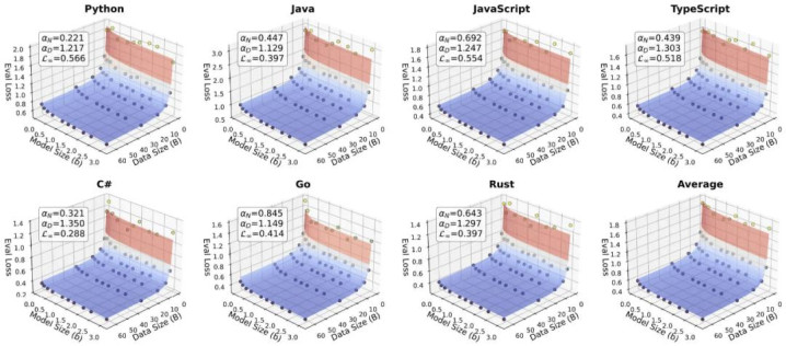 图 2:七种编程话语各自孤立的 Scaling Law 弧线。不错看到 Python(左上)的弧线斜率更笔陡,而 Rust(右下)则更早趋于浮松)